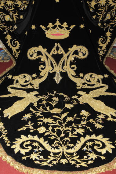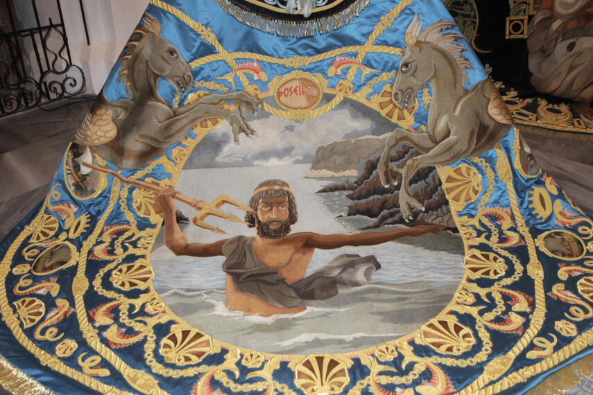 No solo es importante «estrenar» si no también recuperar. Desde hace varios años, el taller de bordados del Paso Azul esta inmerso en la recuperación y restauración de los mantos de la Caballería del Triunfo. Sin duda se trata de uno de los conjuntos de bordados más valorados de nuestra Semana Santa. Este año se ha renovado el oro del manto de Poseidón.
