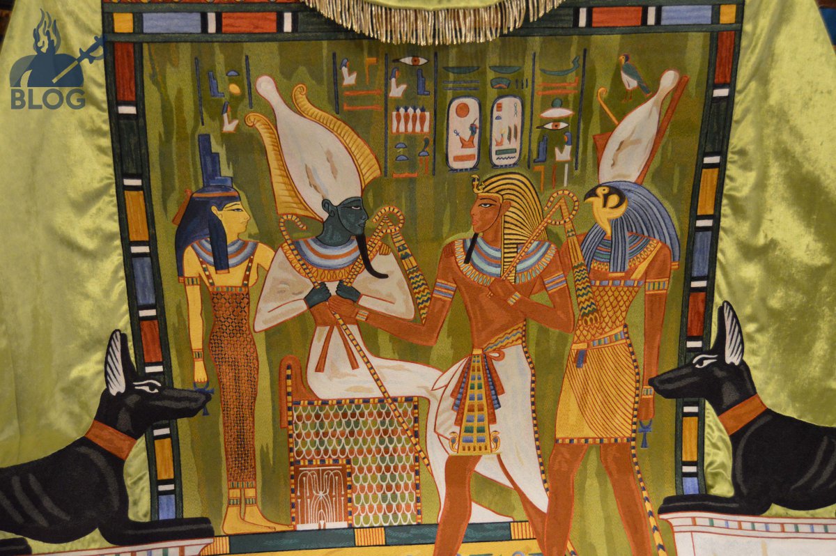 El manto, de color azul, recoge detalles del zodiaco egipcio del templo de Denderah, único dedicado a la diosa Nut.